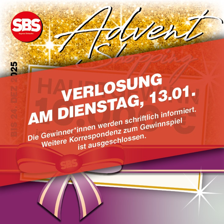 Die Hauptverlosung vom SBS-Weihnachtsgewinnspiel erfolgt am Dienstag, 13.01.2026 im Kongresshaus St. Johann unter notarieller Aufsicht.